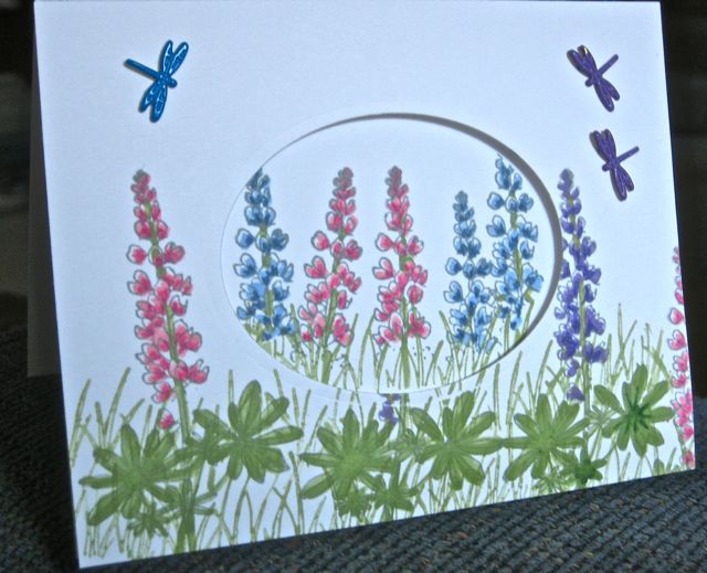 I Googled Lupine images to see what colors they came in and I got this layout idea from looking at the images. I cut out the oval on the top panel with a Nestability. I stamped the Lupine image several times with Memento London Fog inside the oval on a background panel. Then I stamped the image again on the front panel with the cut out oval. I used RI's grass border stamp as well, then colored in the lupine with SU! markers. I added the dragonfly brads and mounted the top panel on dimensionals.
